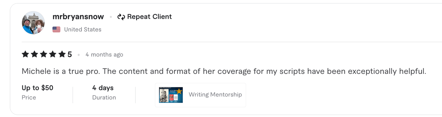 Michele is a true pro. The content and format of her coverage for my scripts have been exceptionally helpful.